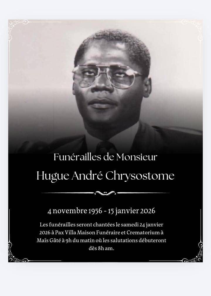 Les funérailles du professeur Hugue André Chrysostome, figure éminente de l’enseignement haïtien, se sont déroulées le samedi 24 janvier à Pax Villa Maison Funéraire et Crematorium, à Maïs Gâté. Décédé le jeudi 15 janvier 2026, peu après son admission à l’hôpital vers 18 h 10, celui qui fut le produit d’au moins six facultés en Haïti et au Mexique laisse derrière lui l’image d’un intellectuel d’exception et d’un éducateur hors pair.