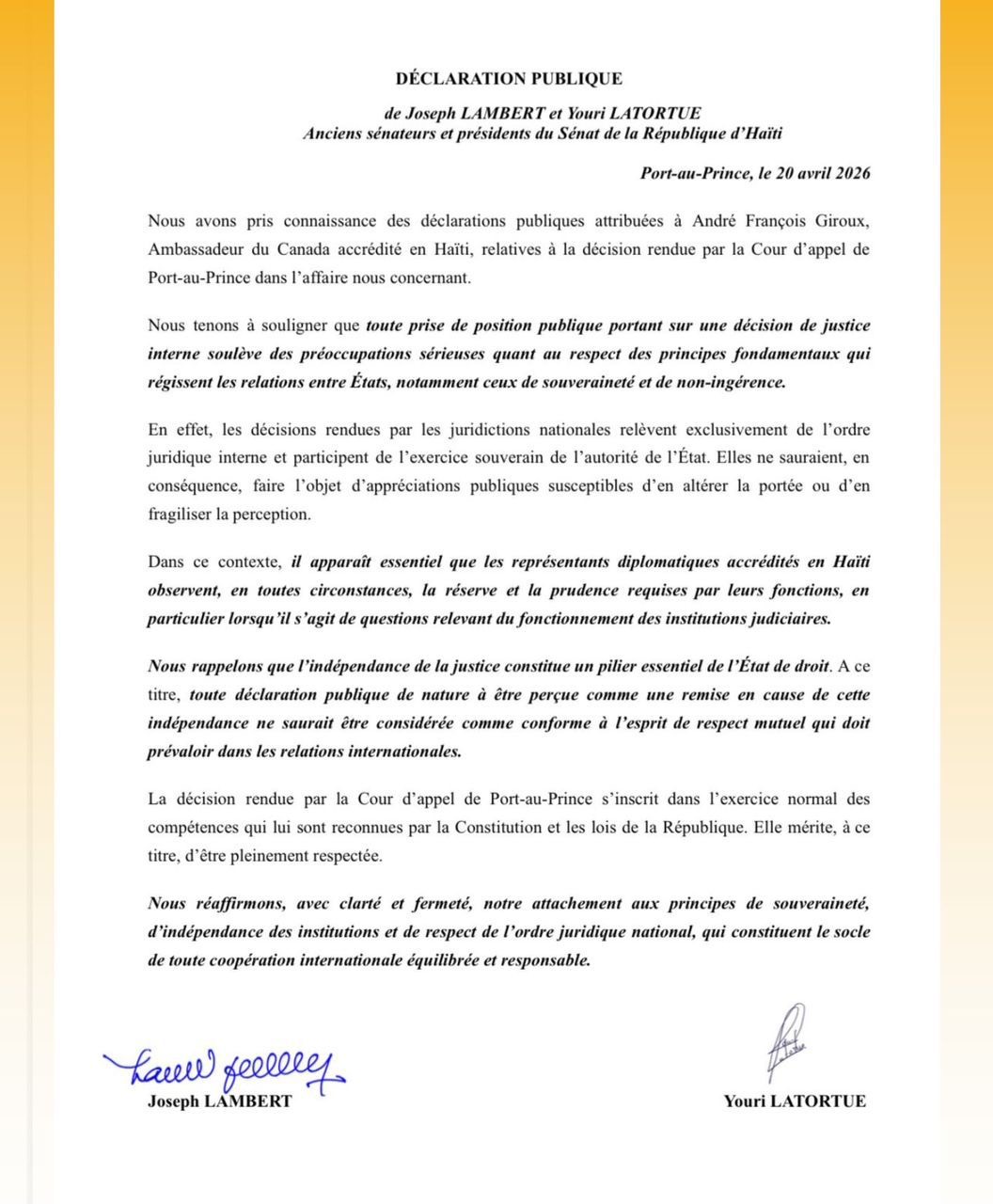 Dans une déclaration publiée le 20 avril 2026 à Port-au-Prince, Joseph Lambert et Youri Latortue critiquent des propos attribués à André François Giroux concernant une décision de justice les impliquant.