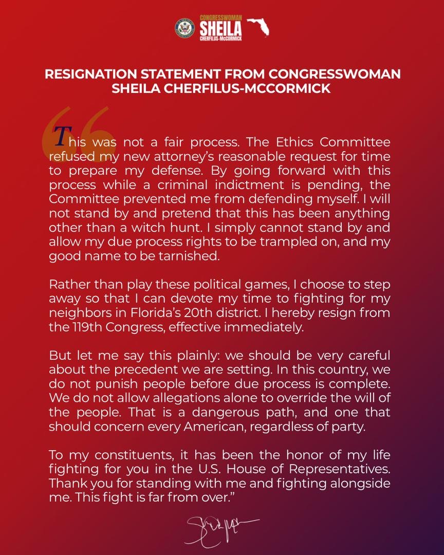 La congresswoman démocrate de Floride, Sheila Cherfilus-McCormick, a annoncé sa démission du Congrès des États-Unis ce 21 avril 2026, quelques instants avant une audience décisive de la commission d’éthique de la Chambre des représentants.
